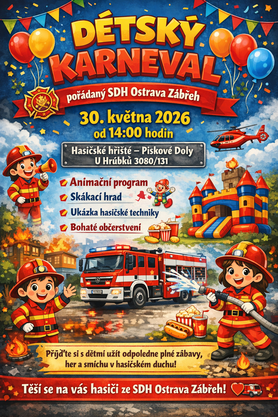 SDH Ostrava Zábřeh zve všechny děti a jejich rodiče na Dětský karneval, který se uskuteční 30. 5. 2026 od 14:00 hodin na hasičském hřišti Pískové Doly – U Hrůbků. Připraven je animační program, skákací hrad, ukázka hasičské techniky a bohaté občerstvení. Přijďte si užít veselé odpoledne plné zábavy!